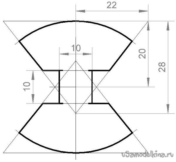 В разметке нет ничего сложного. Не нужно высчитывать градусы, длины дуг и т.п. Вначале наносятся все прямые линии, а потом проводятся две дуги радиусом 28мм до пересечения с прямыми и разметка готова.
