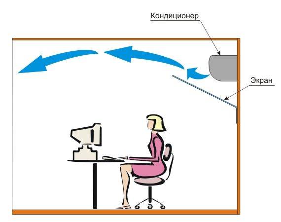 И если в холле гостиницы или в большом помещении магазина, человек не постоянно находится в непосредственной близости от холодного потока воздуха, то рабочее место в офисе или место зрителя в кинотеатре передвинуть невозможно. В этом случае также придут на помощь экраны для потолочных кондиционеров.