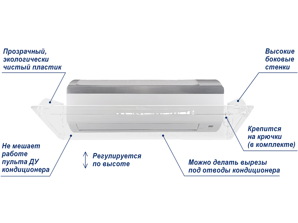 Действует аналогично экрану для сплит-системы, направляя воздух в потолок, благодаря бортикам, загнутым кверху.