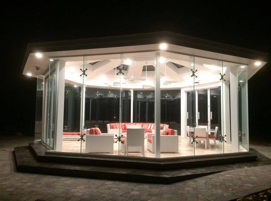 Считается одним из современных и наиболее привлекательных вариантов дизайна. Применяется для конструкций любой архитектуры. Безрамный остекленный каркас – единственная возможность возвести сооружение без каких-либо стоек, но с прекрасным сохранением панорамы. Вы сможете легко открыть стеклянный проём в тихий, солнечный день, а затем закрыть его в случае непогоды. Безрамное остекление чем-то похоже на сплошную стену из стекла. Отсутствие рам только на руку владельцам, ведь ничто не будет ограничивать пейзаж и все, что происходит за пределами беседки.