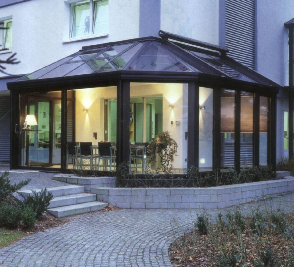 Фасадное остекление. Конструкция изящного вида и хорошо пропускает свет. В этом варианте обычно и крыша делается стеклянной. Стекло выбирается безопасным – закаленным или триплекс. Для кровли можно использовать поликарбонат (см. Крыша для беседки из поликарбоната: в чем отличия от других материалов). При фасадном остеклении: