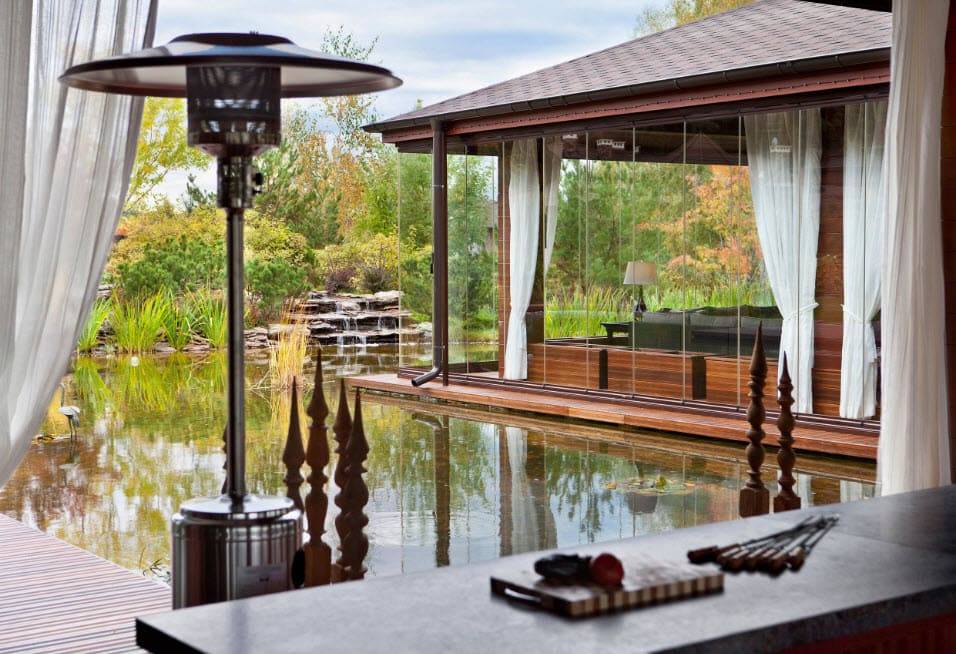 Один из лучших вариантов расположения беседки – у водоема. Панорамное остекление откроет вид на водную гладь и защитит от комаров. Удовольствие созерцания воды будет доступным и поздней осенью, и ранней весной. Для обогрева прохладными вечерами стоит установить камин, работающий на твердом топливе, газе или электричестве. Водоем может быть и искусственным и настоящим, от этого эстетическая ценность не уменьшится.