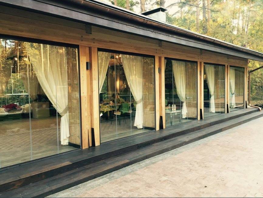 Безрамное остекление. В этом случае герметичность полностью отсутствует, но большой толщины рамы не портят вид и предоставляют взглядам красивый пейзаж за окном.