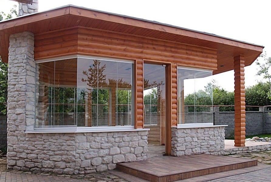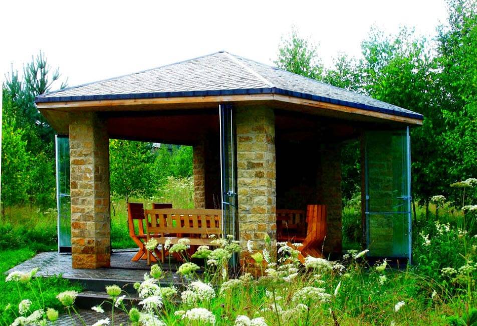 Можно найти много готовых проектов беседок из камня, из дерева, даже из стеклянных бутылок. Проще всего в данном случае соорудить беседку с безрамными конструкциями, которые легко крепятся с помощью триплекса. Если вы хотите традиционную деревянную беседку с большими окнами, то нужно позаботиться о толстом закаленном стекле, а окантовку сделать небольшой.