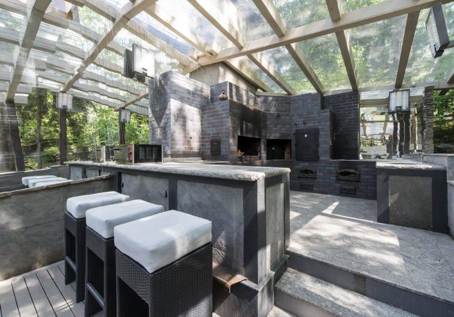 Мангал на даче перестал быть роскошью, а является неотъемлемой частью вечерних посиделок в кругу семьи летом. Современные застекленные беседки позволяют сооружать мангал под навесом для защиты от непогоды. Прозрачные стены открывают взору пейзаж, ветер и дождь не мешают отдыху и приготовлению ужина на костре с дымком.