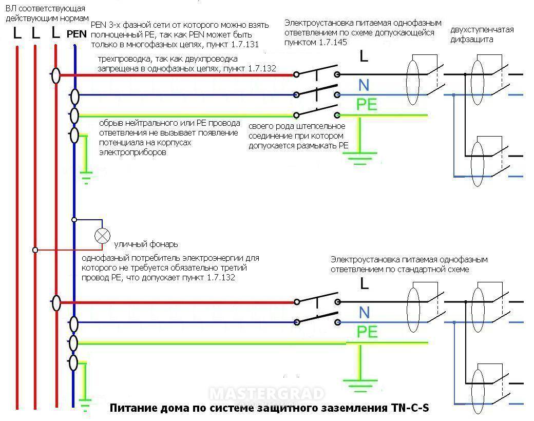 - TN-C-S, из названия которой следует, что на части трассы проводники PE и N объединены, а начиная с какого-то места они прокладываются раздельно.