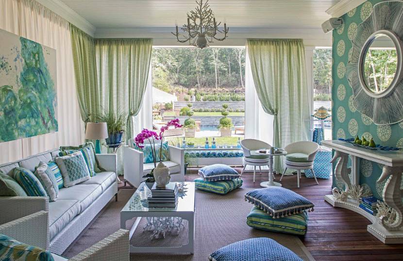 Изумрудный с голубым будут выглядеть органично в интерьере гостиной, но для создания завершенного дизайна потребуется добавить натуральное дерево. Это могут быть деревянные полы или мебель, другие аксессуары. Можно добавить немного бежевого, серого, белого цветов.