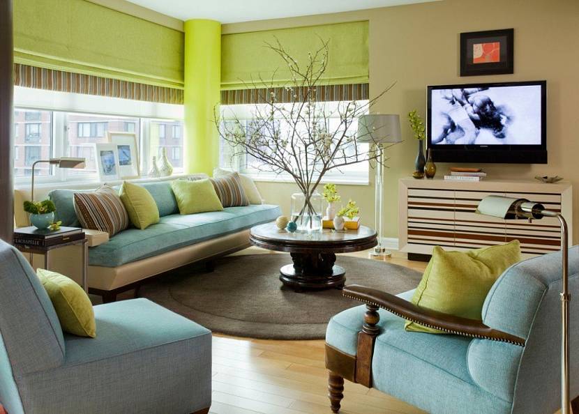 Даже маленькая гостиная может стать уютной, стильной, если отделать ее светлыми оттенками изумрудного или фисташкового. Лайм подойдет тем, кто не боится смелых решений, ярких интерьеров. Особенно если подобрать темную мебель, текстиль.