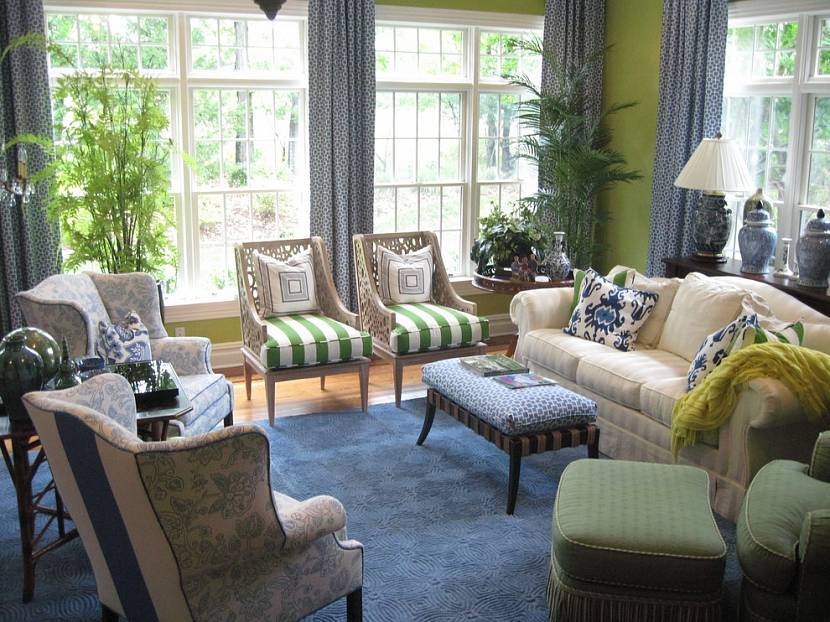Чтобы обновить интерьер, достаточно просто поменять обивку диванов, кресел: сделать ее зеленой, а для полноты картины купить такие же шторы, абажуры для светильников. Для более дорогого интерьера потребуется добавить золотистый или ярко-лимонный цвета.