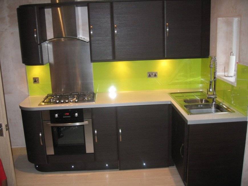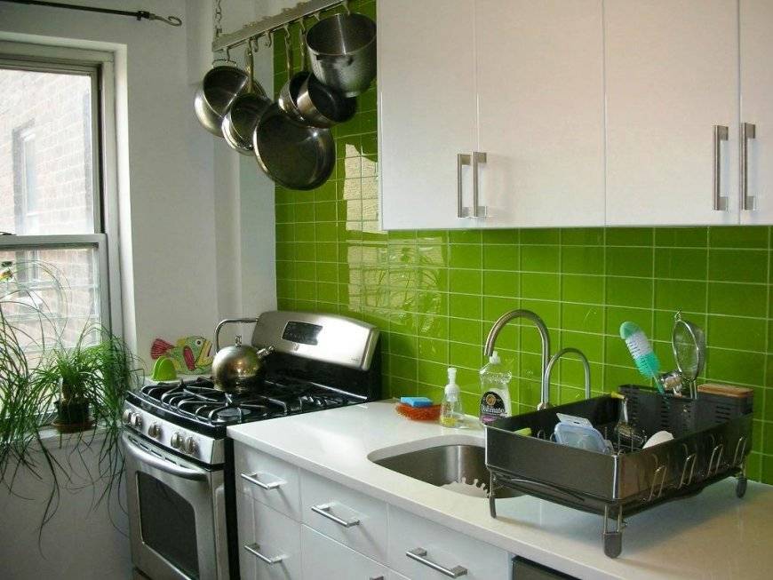 Небольшой кухне подходят светлые оттенки гарнитура: нежно-зеленый, фисташковый. Темные оттенки кухонной мебели в миниатюрном помещении могут создать угнетающую обстановку. При этом учитывайте то, что зеленый гарнитур подходит белым или бежевым стенам.