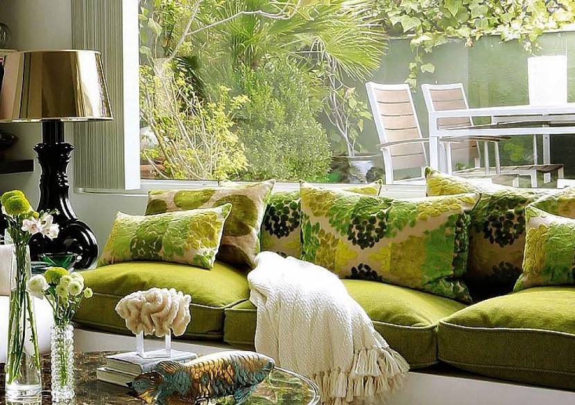 - в крупных пространствах с помощью ярких салатовых оттенков можно выделить отдельные зоны. К примеру, просторную гостиную модно разделить на зону для приема гостей и отдыха, а спальню – на зону сна, работы и гардеробную;