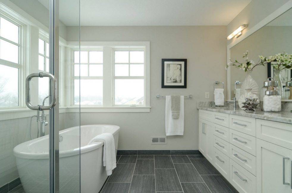 Выбирайте для пола большую плитку с шероховатой поверхностью, а для стен глянцевую. Рисунок плитки должен бать аналогичным или в одном стиле. Полы сделайте немного темнее, чем стены. Некоторые коллекции предлагают такие варианты. В результате соединение серых поверхностей, белоснежных сантехнических приборов, светильников, зеркал делают помещение большим и элегантным.