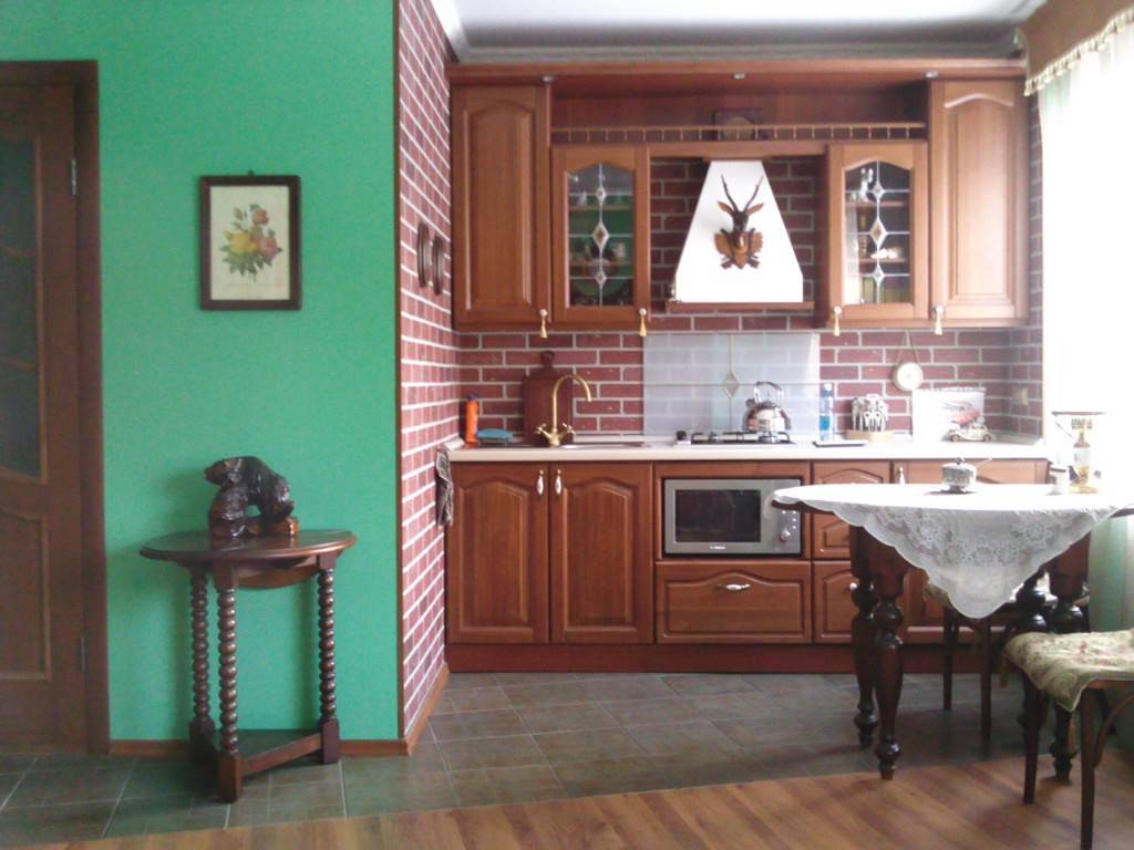 Наилучшей дизайнерской находкой станет оформление всей кухни, начиная с обоев или краски на стенах, потолочного покрытия и заканчивая драпировкой мебели, в нескольких тонах вышеназванных цветов. При этом один из них должен быть преобладающим. Например, ярко-оранжевый соединяют с различными оттенками зеленого (допустимы как яркие, так и достаточно сдержанные варианты).