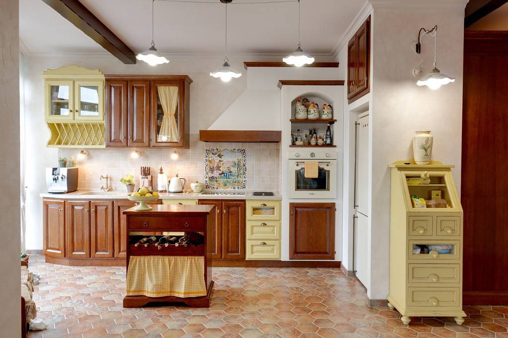 Деревенский прованс характеризуется мягкими кремовыми оттенками, которые присутствуют в окраске мебели из натурального дерева и фасаде кухни.