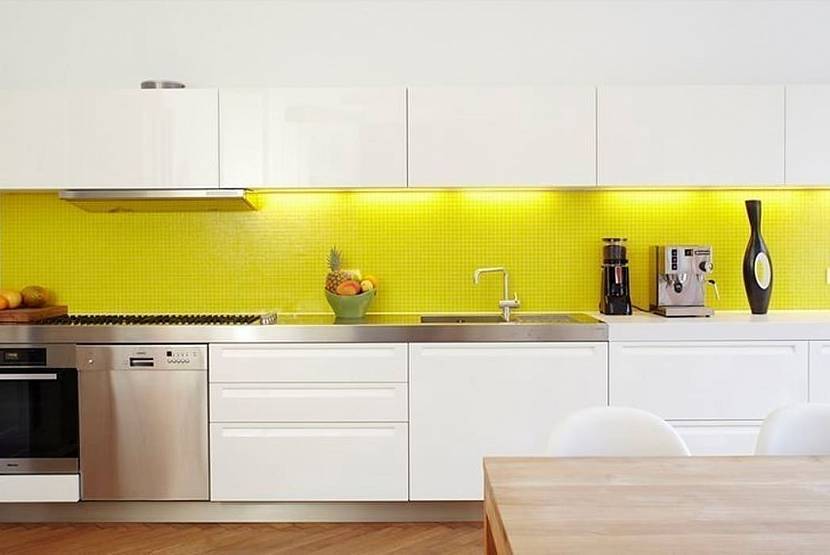Такая кухня уже не выглядит скучной и бледной, жёлтый фартук наполнил интерьер весёлым настроением и позитивом.