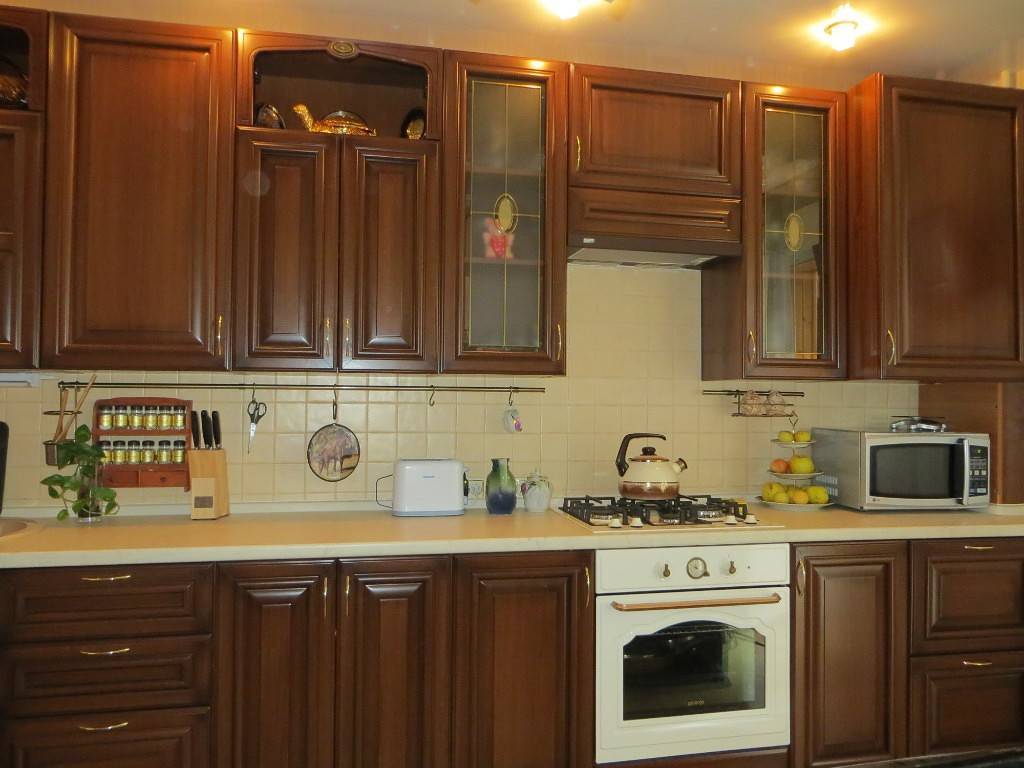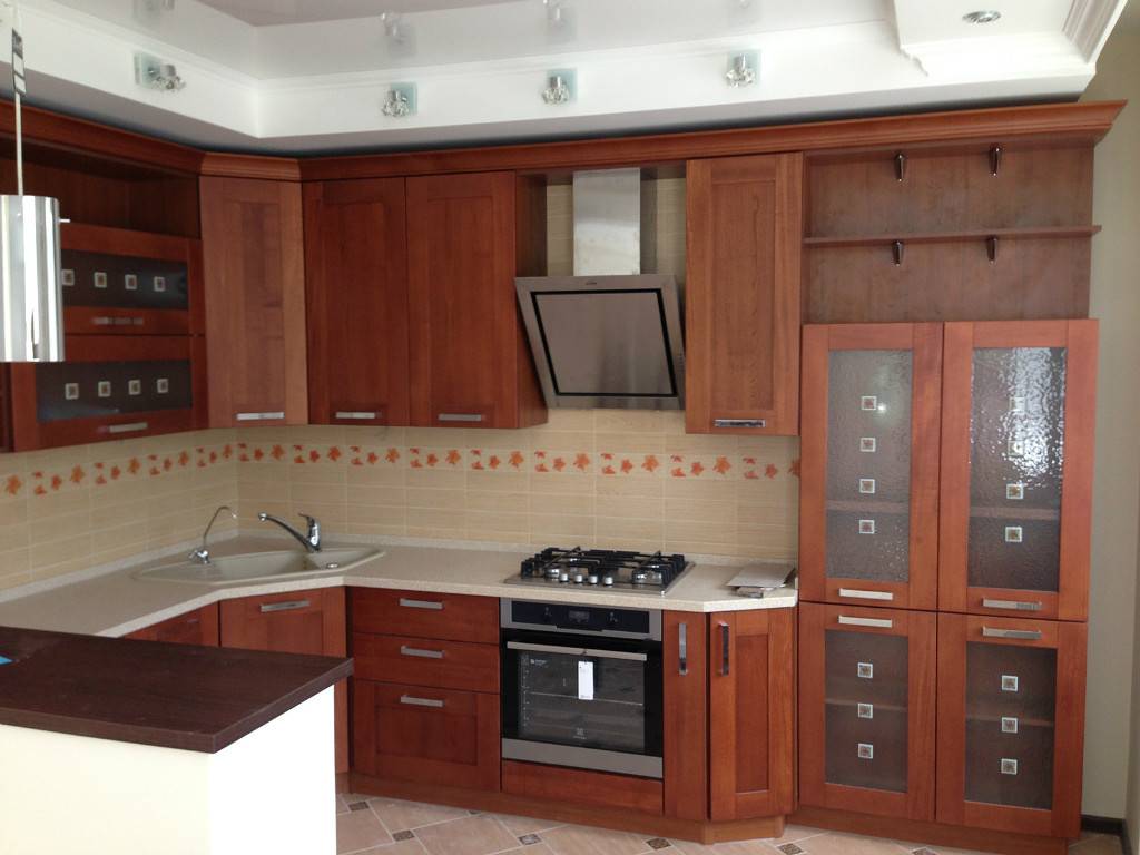 При словосочетании «светло-коричневая кухня» всплывает образ кухонного гарнитура из натурального дерева с вычурной отделкой. Такое решение будет выглядеть солидно, дорого и основательно.