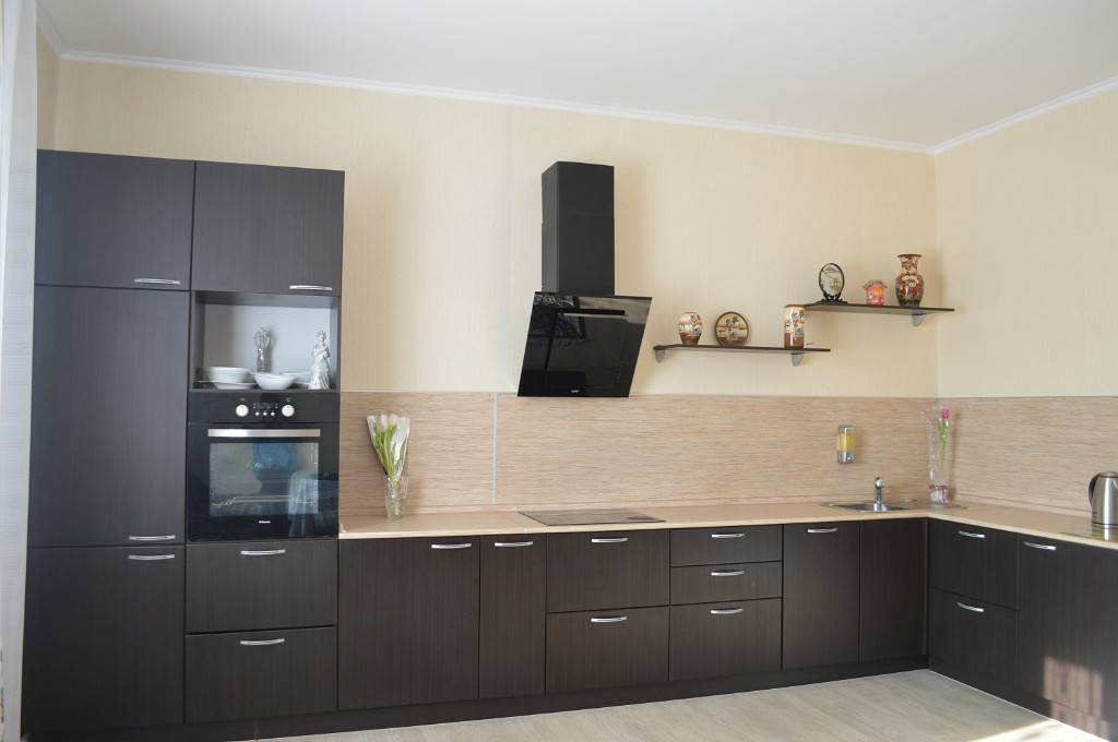 Бежевые кухни с черной либо темной столешницей — хороший способ разбавить монотонное оформление комнаты.