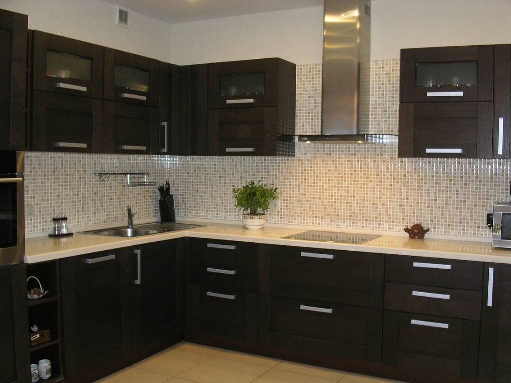 Для фартука уместна кафельная плитка с шоколадным орнаментом, глянцевая или матовая.