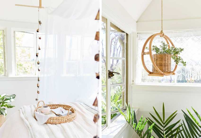 Для полового покрытия можно использовать шпунтованную половую доску или листовое пробковое покрытие. Пол покрывают специальным бесцветным лаком для сохранения естественного цвета древесины. В качестве эксперимента можно дополнить интерьер акцентами зеленых и голубых оттенков.