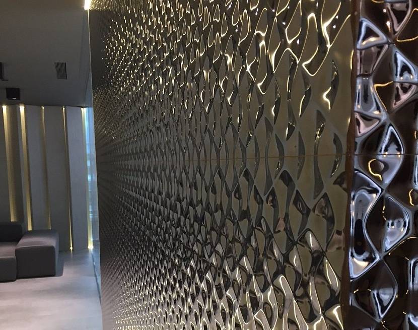 - С металлизированным эффектом. Зеркальная плитка визуально напоминает золото и серебро, бронзу и хром. Встречаются варианты с искусственной коррозией.