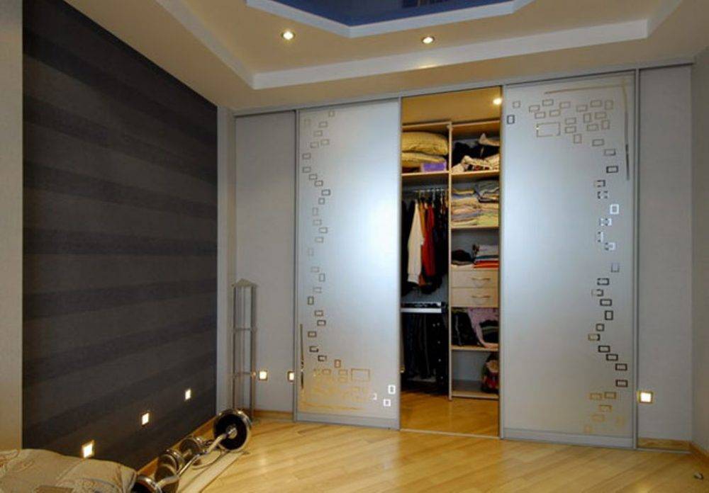 На фото спальня и гардеробная с раздвижными дверями, выполненными из матового стекла.