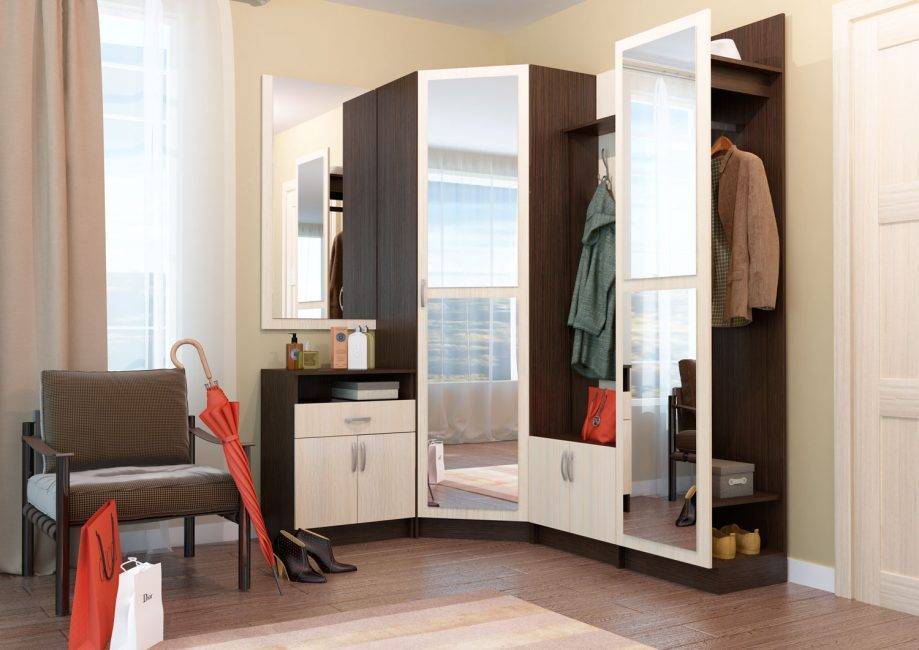 Если прихожая достаточно просторная, то подойдет мебель без боковых стенок, которая будет соприкасаться со стенами. Для малогабаритных прихожих можно подобрать не треугольный, а пятиугольный шкаф.