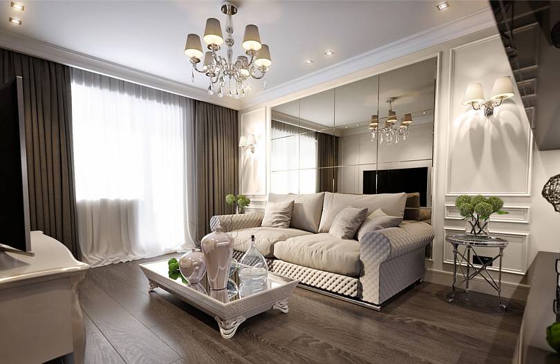 - В мебель. Грамотно расположенная мебель со встроенной отражающей поверхностью, будет отзеркаливать искусственный или естественный световой поток, тем самым придавая комнате дополнительного света и некой визуальной легкости.