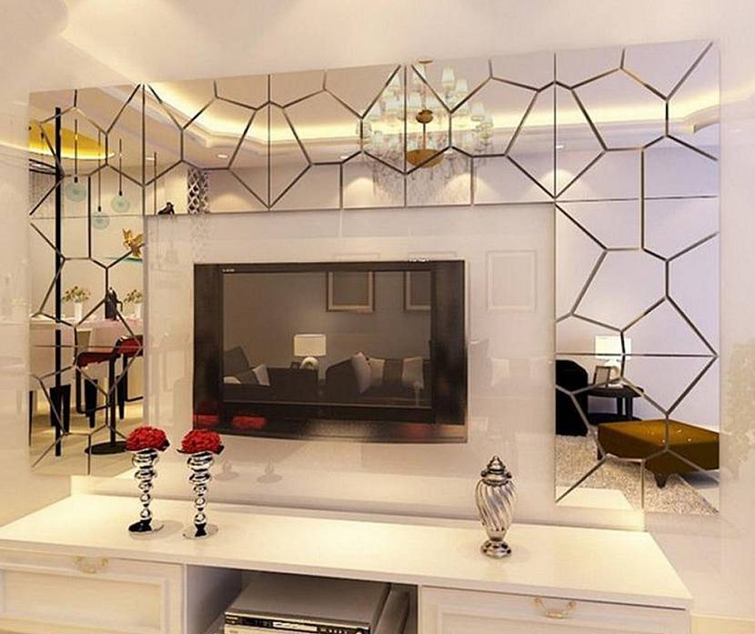Если зал для приема гостей выглядит слишком стандартно, то добавление зеркального декора сделает его стильным и современным. Интересным и оригинальным ходом будет обрамление телевизора панно в форме буквы «П». Причем можно приобрести панели, состоящие из многоугольных кусков зеркал. Такое украшение подойдет комнате, выдержанной в светлых тонах.