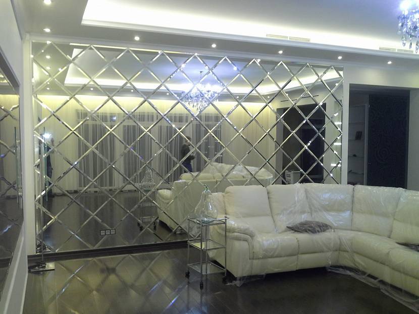 В большой гостиной смелым решением будет стена, полностью состоящая из ромбовидных зеркал. Рядом с такой перегородкой гармонично смотрится многоуровневый потолок с дополнительной подсветкой. А венцом оформления будет громадная хрустальная люстра посередине комнаты.