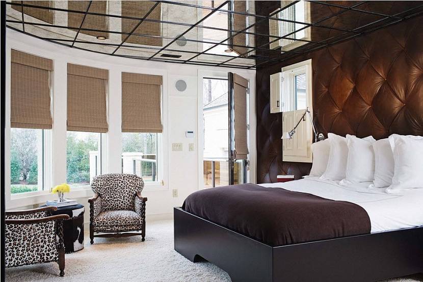 Великолепно смотрится зеркальный потолок. Но бытует мнение, что отраженное спальное место со временем начнет давить на психику. Поэтому, если существует привычка спать на спине, лучше отказаться от такого украшения.