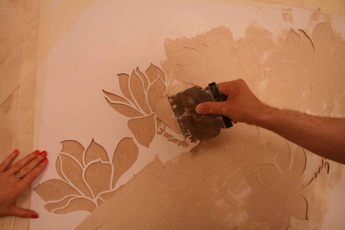 К тому же пользоваться трафаретом можно и проще: очертить границы рисунка, заполнить контуры жидкими обоями, срезая лишнее шпателем или ножом.