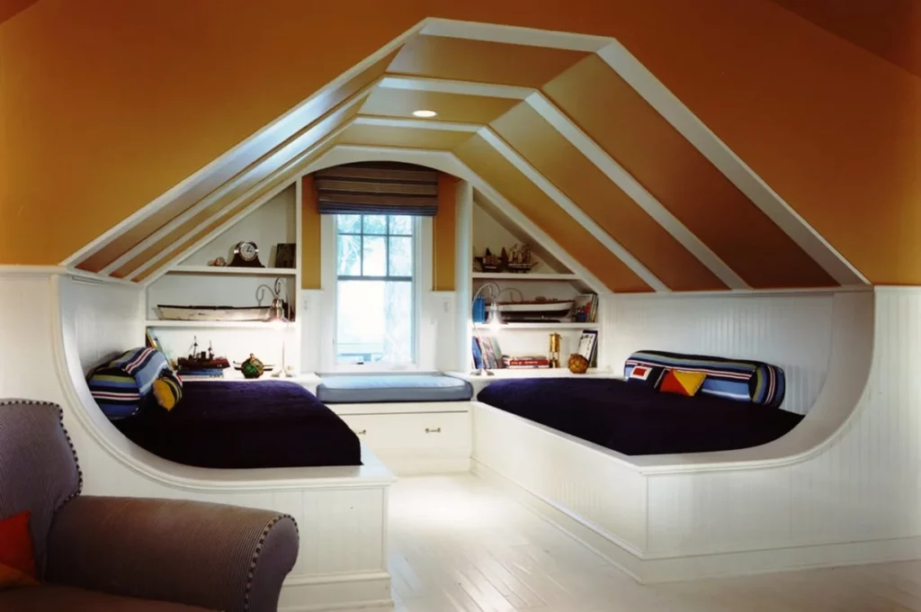 Уютная и функциональная комната на чердаке под крышей имеет такие достоинства: