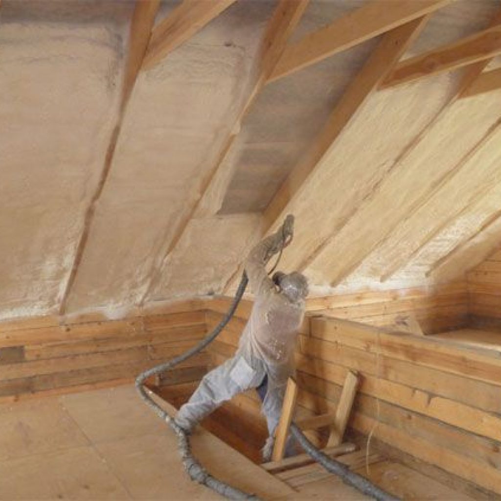 - При выборе пенополиуретана предварительная гидроизоляция не требуется, так как он прекрасно сам отталкивает воду. Его необходимо просто задуть в свободное пространство между балками.