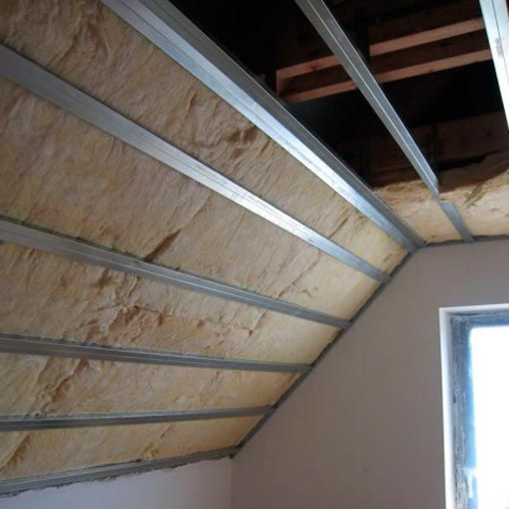 - Тепло- и звукоизоляция. Если изначально кровельный пирог не был подготовлен профессионально, придется улучшить его свойства изнутри. В качестве изолирующего материала используется минеральная вата, пенополиуретан. На горизонтальных поверхностях удобно монтировать плиты, на скосах — рулонный материал.