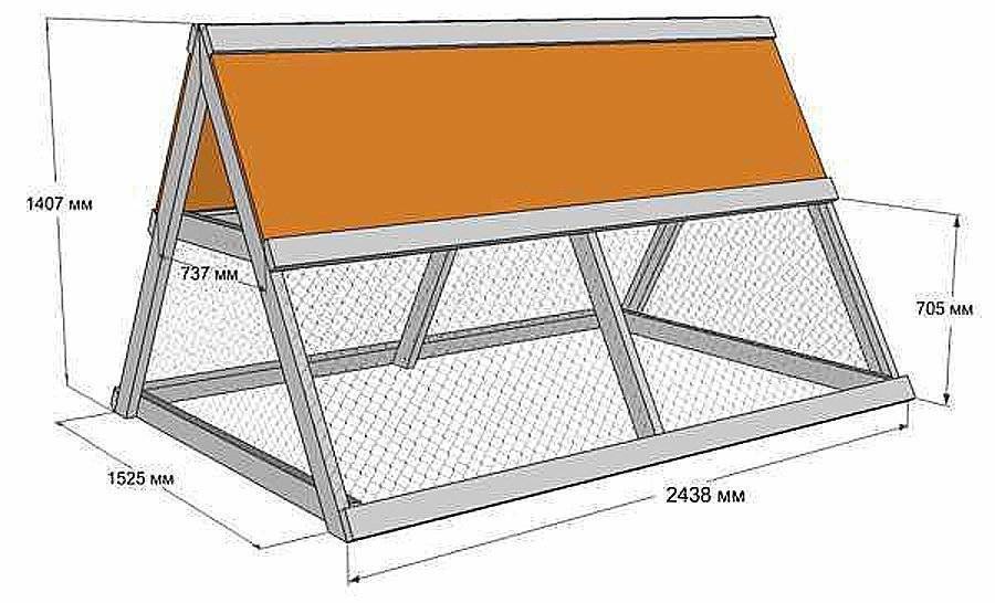 Мобильный курятник можно легко перемещать, а значит размеры его будут минимальными. В нём предусмотрена возможность кормления и ухода за птицей без присутствия человека внутри. Как правило, рассчитаны они на небольшое количество птиц (от 3 до 10 шт.). Каркас делается из брусков, а основные элементы (дверки, крыша) — из ОСБ-плит, ДВП, горбыля и других подручных материалов.