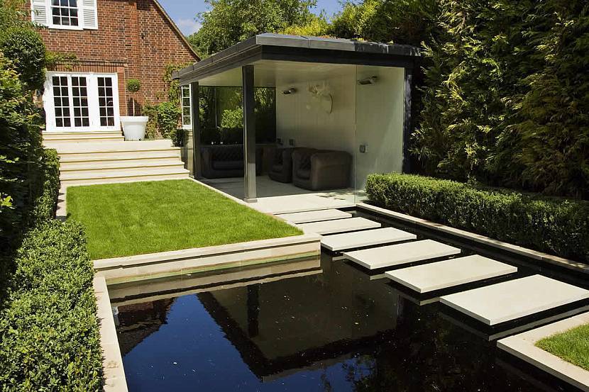 Оформление двора в модернизме с искусственным водоемомИсточник roomester.ru