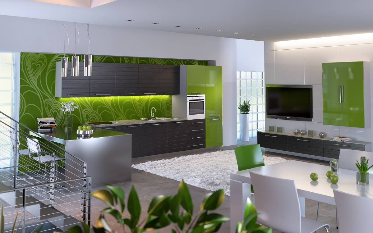 Салатовый цвет, как правило, используется для оформления глянцевых фасадов, он также может присутствовать в элементах декора и украшать кухонный инвентарь.