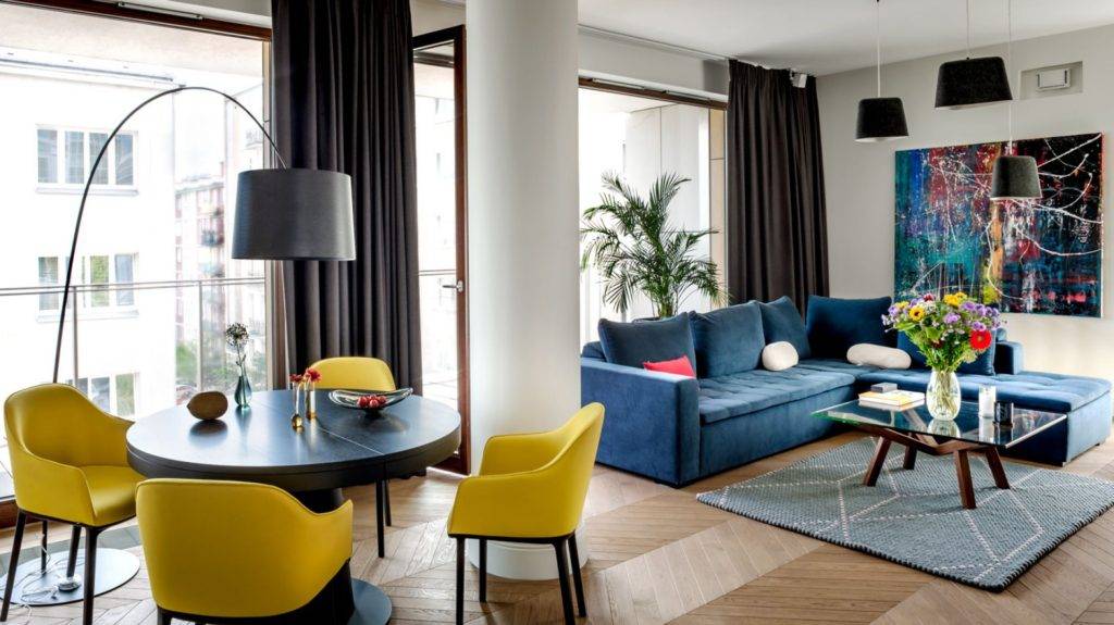Можно смело попробовать сочетать два ярких цвета, главное, сгладить их контраст более спокойными оттенками мебели.