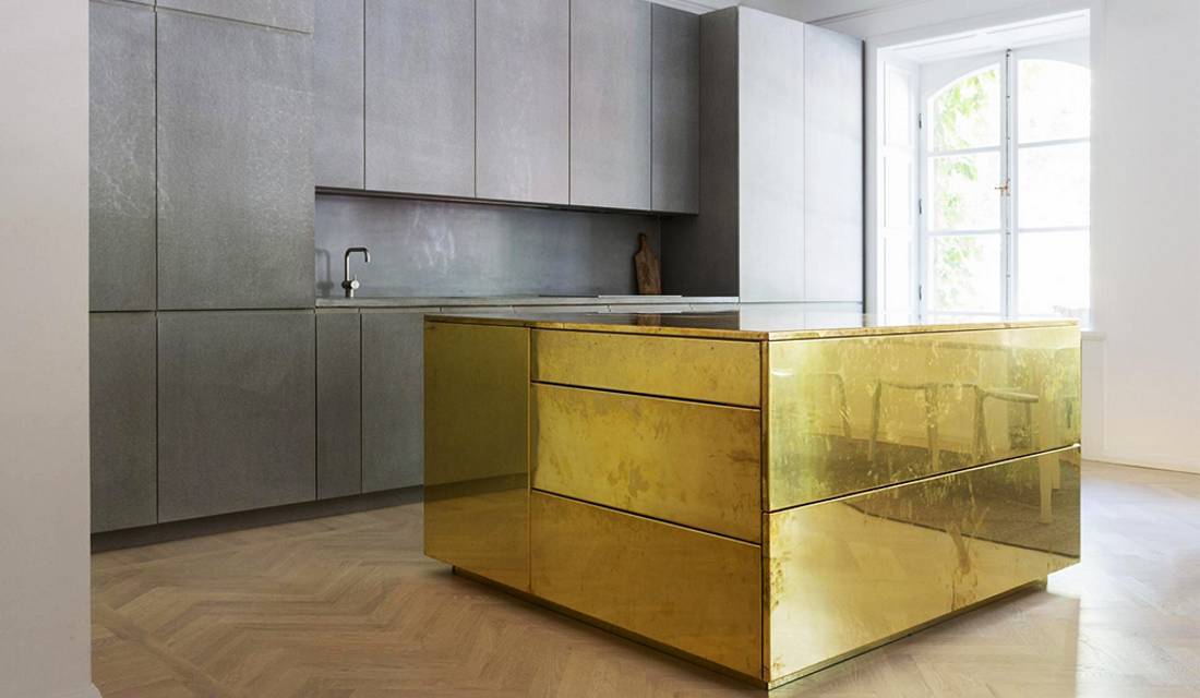 Золотой остров отлично впишется в серую отделку и гарнитур кухни стиля “хай-тек”.