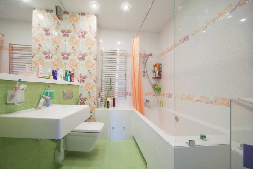Декоративный прием зонирования пространства заключается в создании яркого акцента. Например, одну из функциональных зон выделяют ярким материалом, для облицовки остальной части стен используют кафель нейтральных оттенков. Спокойный тон можно совместить с бордюром насыщенного цвета.