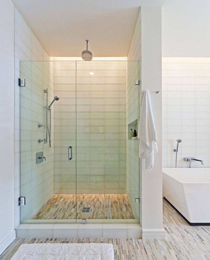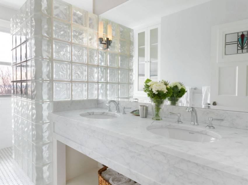 В санузле перегородки из стекла традиционно решают две основные задачи: ограждают стационарную душевую кабину и позволяют разделить помещение, не уменьшив его визуально. Стекло отлично сочетается с плиткой, сантехникой, зеркалами, акрилом и хромированными деталями, поэтому вписывается в санузел, как родное.