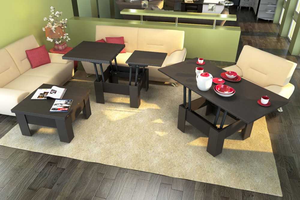 Благодаря такому виду мебели, как трансформаторы, в две секунды компактный журнальный столик может превратиться в обеденный стол на несколько персон, специальный механизм, позволяет раскрыть спрятанные в основу две части большой столешницы, а также сделать изделие значительно выше.
