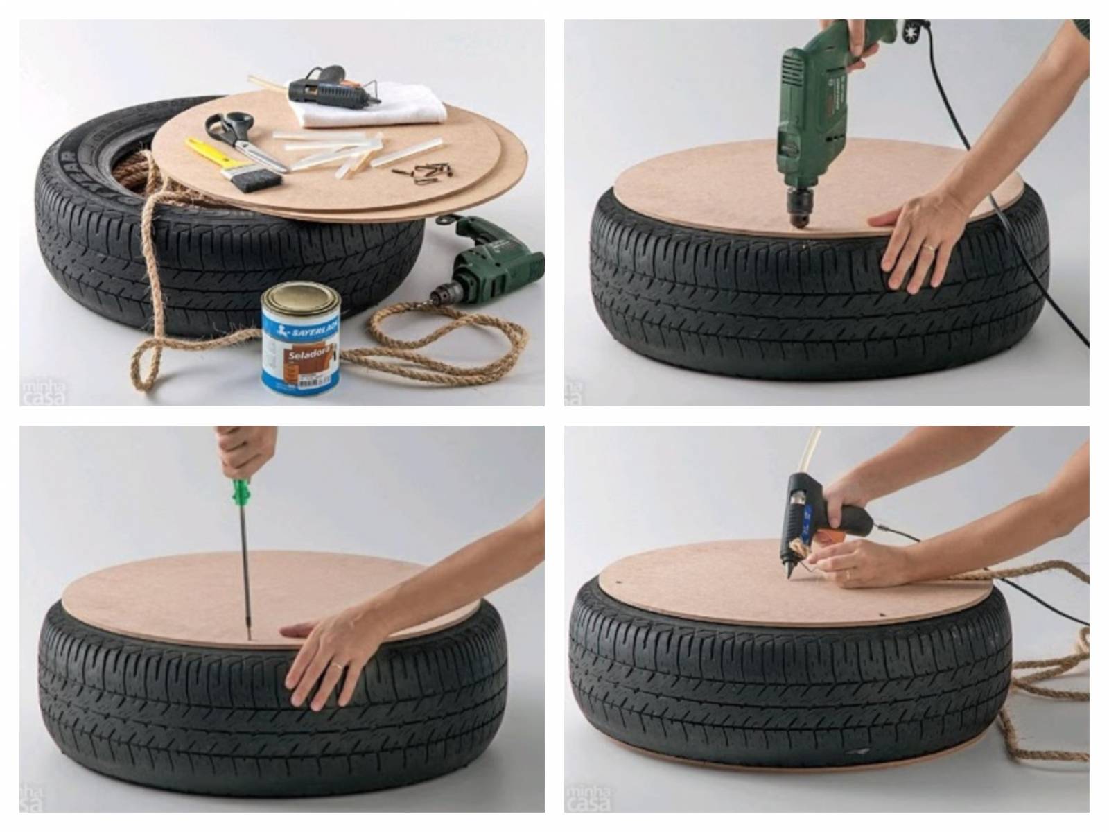 Далее делаются замеры и вырезания. При помощи гибкого сантиметра определяется, каким диаметром будет покрышка. Подготовьте заранее лист из фанеры или ДСП, а может и ДВП. Он понадобится для того, чтобы сделать заготовку для столика круглой формы. На этом листе необходимо начертить нужного диаметра круг, после чего вырезать его, используя электрический лобзик