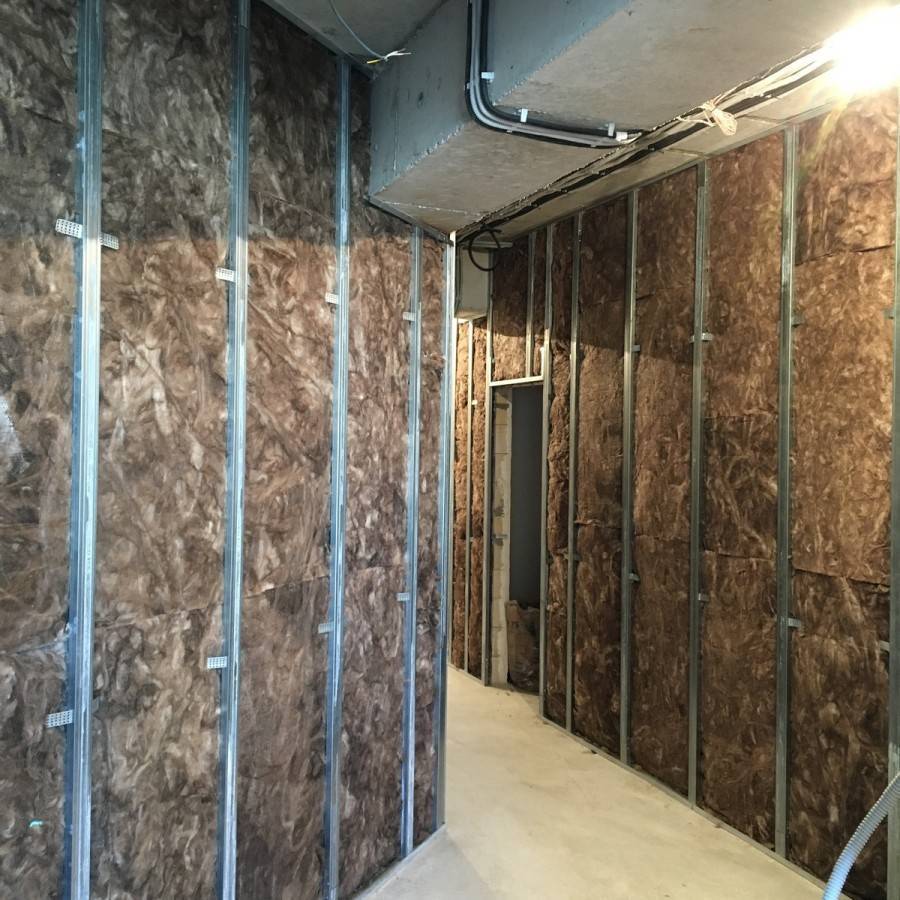 Для улучшения звукоизоляции используется каркас под гипсокартон, заполненный звукоизолирующим материалом.